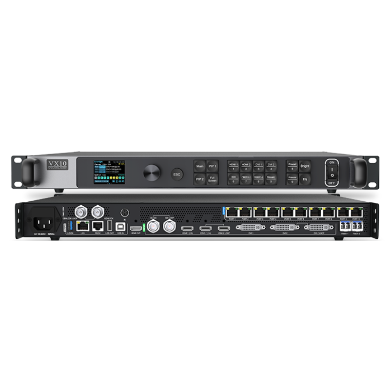 Procesor wideo VX10 marki Colorlight to zaawansowane urządzenie stworzone z myślą o profesjonalnym zarządzaniu treściami na ekranach LED i LCD. Obsługując wysoką rozdzielczość 4K, VX10 jest idealnym rozwiązaniem dla dużych i złożonych instalacji multimedialnych, takich jak eventy, wystawy czy reklamy wielkoformatowe.
